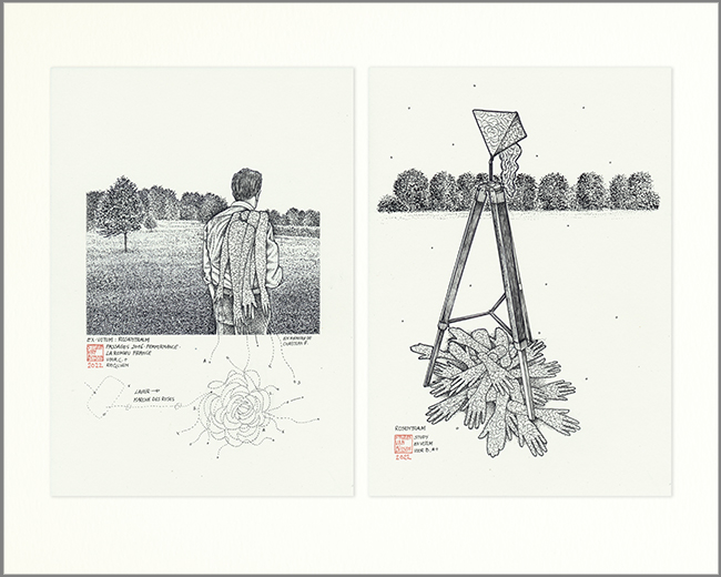 Wanderings? Because my artistic work has evolved so multidisciplinary, I have an extensively documented personal archive. It seemed particularly interesting to connect in a current way with the vision and work (in this case graphics) of Albrecht Dürer. Not only in terms of technique (pen on paper), his humanism, but also as a tribute to his 'modernity', which is still a source of inspiration.